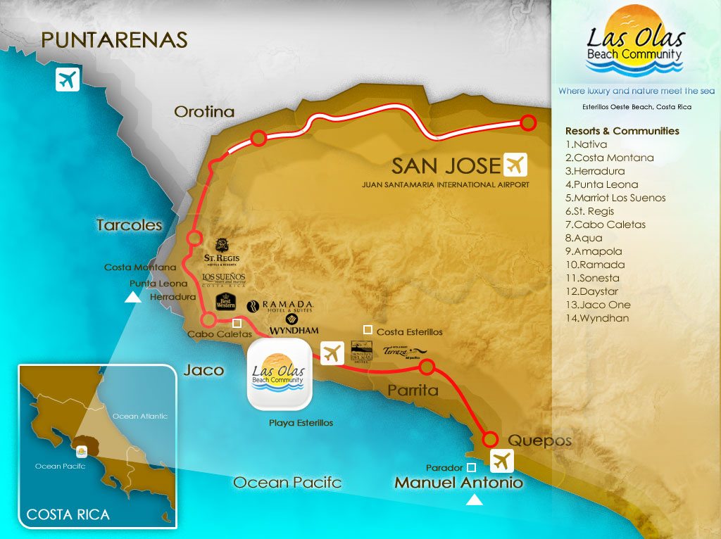 Las Olas Beach Community is located on the Central Pacific Gold Coast in Esterillos Oeste, 15 minutes north to Jaco Beach and 40 minutes south to Manual Antonio National Park, the most popular tourist destination in Costa Rica. This is one of the nicest beaches in Costa Rica, with wide and pristine beaches you can walk for miles and see nothing except the beauty of the nature around you as you breathe in the fresh salt air. Las Olas Beach Community is located in one of the only areas on the Central Pacific Coast where there are hills right next to the ocean. From miles on either side of Las Olas Beach Community, the terrain is flat right next to the beach with no beach access. (see our aerial tour) In fact, most of the property being sold in Costa Rica today is high in the hills with distant views of the ocean. There is really only 1/10 of a percent of good beach front property for sale in Costa Rica. So owing property on a beautiful beach in a popular tourist area is an incredible investment. Property like this just doesn't exist in the US and is very hard to find in Costa Rica. So the location of Las Olas Beach Community is unique, irreplaceable and very valuable.